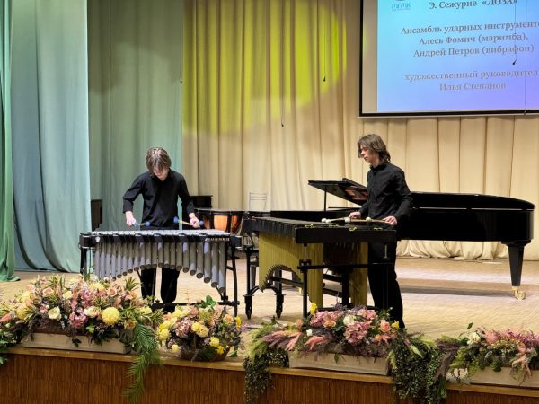Особую атмосферу волшебства дополнило выступление ансамбля ударных инструментов в составе Алеся Фомича (маримба) и Андрея Петрова (вибрафон) (руководитель — обладатель Гранд-премии специального фонда Президента Республики Беларусь по поддержке талантливой молодежи И. Степанов). Инструментальный дуэт исполнил известную концертную пьесу «Лоза» французского перкуссиониста Э. Сежурне. Изящное тембровое взаимодействие вибрафона и маримбы, звучание узорчатой фактуры и этнические ритмы удачно передали образ самой жизни — такой разной, интересной и увлекательной…