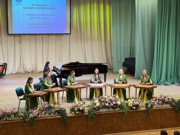 Далее зал наполнился звонкими звуками цимбал. Картина народного гулянья отразилась в музыке «Белорусских танцев» И. Жиновича, которая прозвучала в исполнении обладателя поощрительной премии специального фонда Президента Республики Беларусь по поддержке талантливой молодёжи, лауреата республиканских и международных конкурсов заслуженного любительского коллектива Республики Беларусь ансамбля цимбалистов «Золотая струна» (руководитель А. Полесова,пария фортепиано И. Лукьянова).