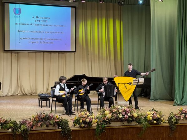 В завершении концерта мы услышали еще два колоритных праздничных номера. В исполнении лауреата международных и республиканских конкурсов А. Каленика (класс преподавателя С. Дубовского) прозвучала задорная белорусская народная песня «Я табун сцерагу» в обработке А. Шпенева (партия фортепиано — Е. Осташкина-Мысливчик). Яркой кульминацией музыкального вечера стало выступление Квартета народных инструментов в составе лауреатов международных и республиканских конкурсов Д. Куделько, А. Каленика, В. Мачалиной и М. Дакимовича (руководитель — С. Дубовский), впечатлившего зрителей блестящей виртуозной пьесой «Тустеп» из сюиты «Старогородские мотивы» А. Цыганкова.
